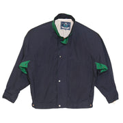 DESCRIPTION: Vintage Members Only jacket in a deep navy with sharp green accents—clean, sporty, and super wearable. Lightweight with an easy snap/zip front and that classic 80s/90s outerwear shape that sits just right. It’s the kind of jacket you throw on and suddenly the whole fit looks intentional.