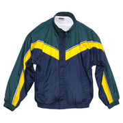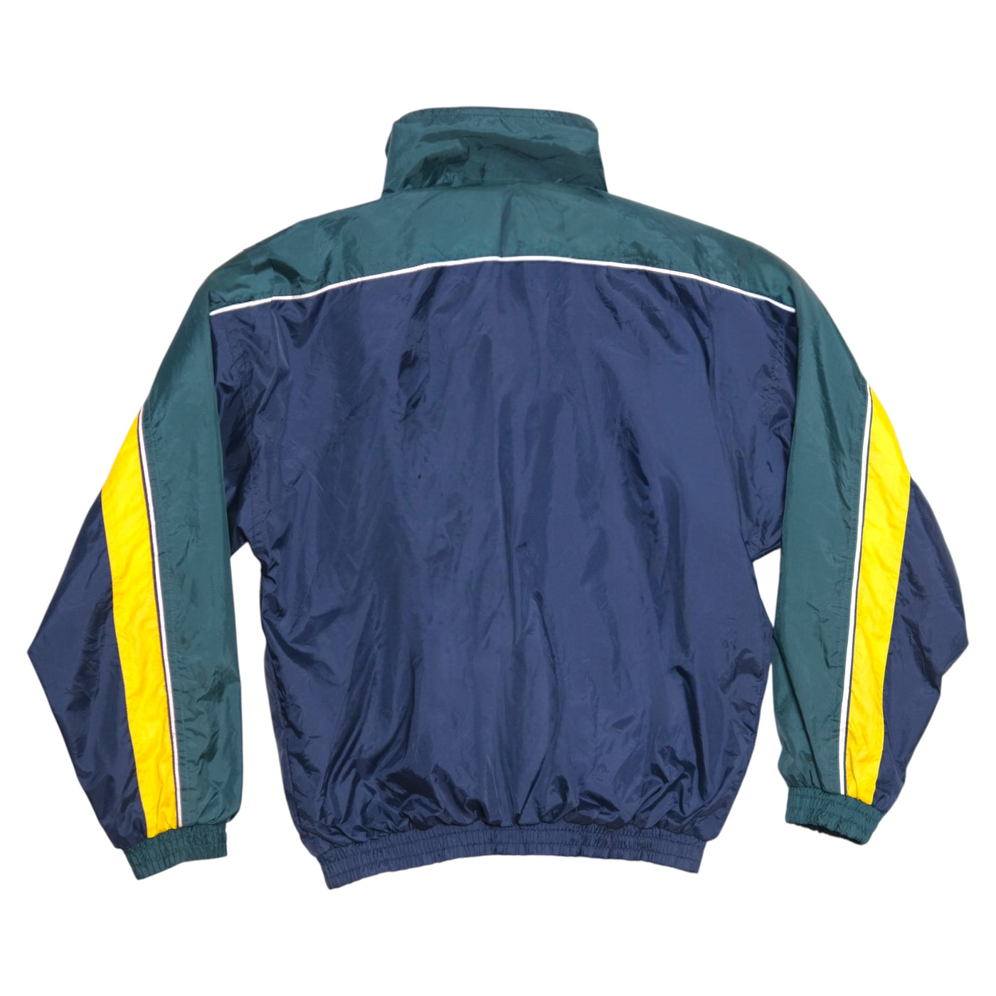 DESCRIPTION: 90s-style Generra Sport windbreaker with a clean colorblock situation—deep navy base, forest green shoulders, and that bold yellow chevron stripe across the chest + sleeves. Lightweight, sporty, and easy to throw on for an instant “I didn’t try but I look good” vibe.